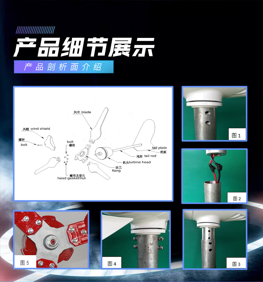 6、獨特的尾舵預(yù)偏設(shè)計,自動精確對準(zhǔn)迎風(fēng)方向,提高輸出功率同時兼顧調(diào)整和強(qiáng)風(fēng)保護(hù)。