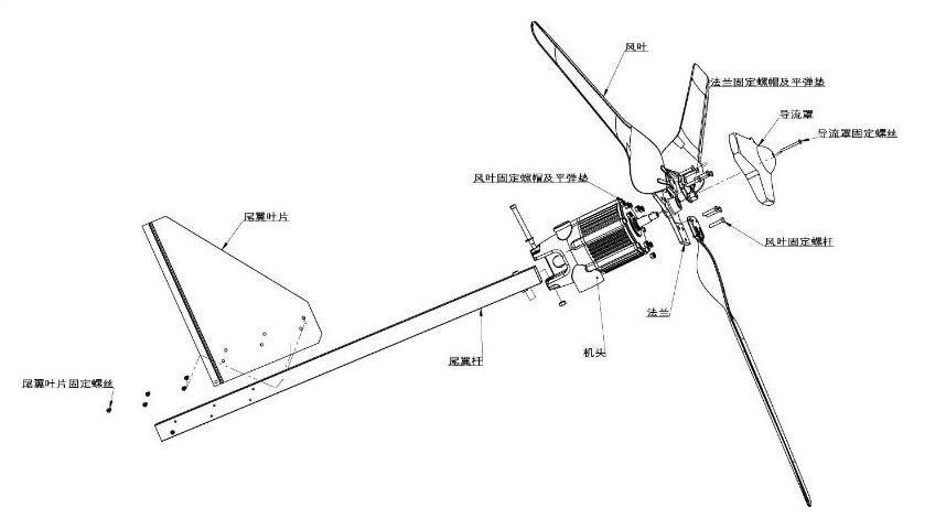 8、采用自動(dòng)對(duì)風(fēng)裝置,使風(fēng)力發(fā)電機(jī)自動(dòng)調(diào)整對(duì)準(zhǔn)迎風(fēng)方向,兼顧調(diào)向靈敏性和穩(wěn)定性,風(fēng)力較大情況下發(fā)電機(jī)尾翼斜置限速保護(hù)風(fēng)機(jī)不受損。